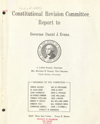Chapters cover Prologue, Framework of Government, the Framework of County Government, Pertaining to the Ballot, the Corporation Article, a Busy Week, Lands and Waters, and an Epilogue. Includes an appendix and bibliography. A thesis submitted in partial fulfillment for the degree of Master of Arts at the University of Washington.